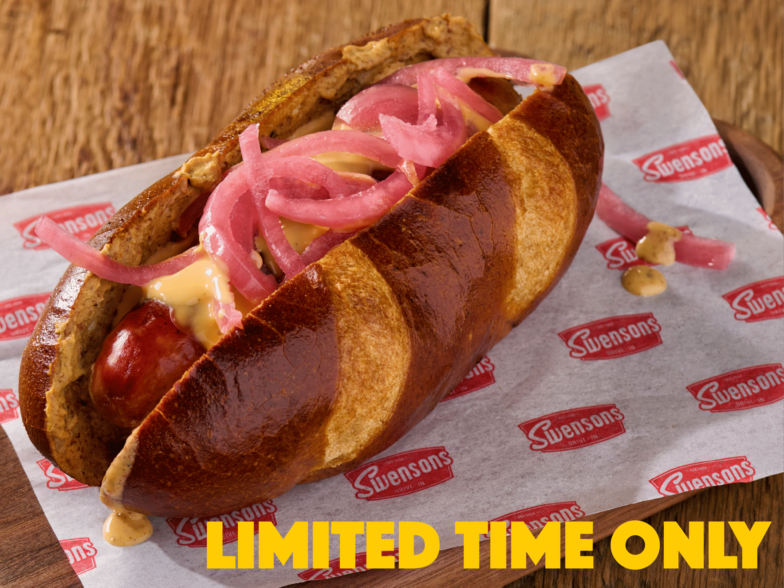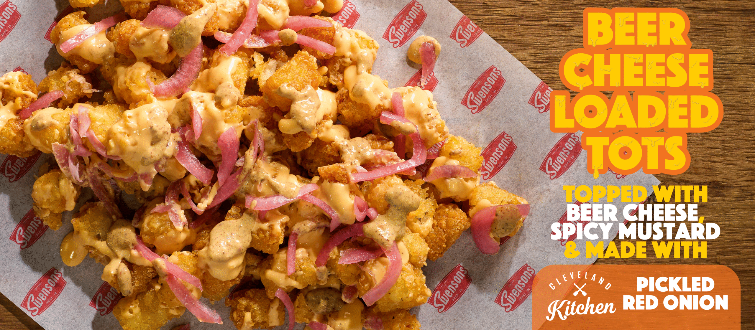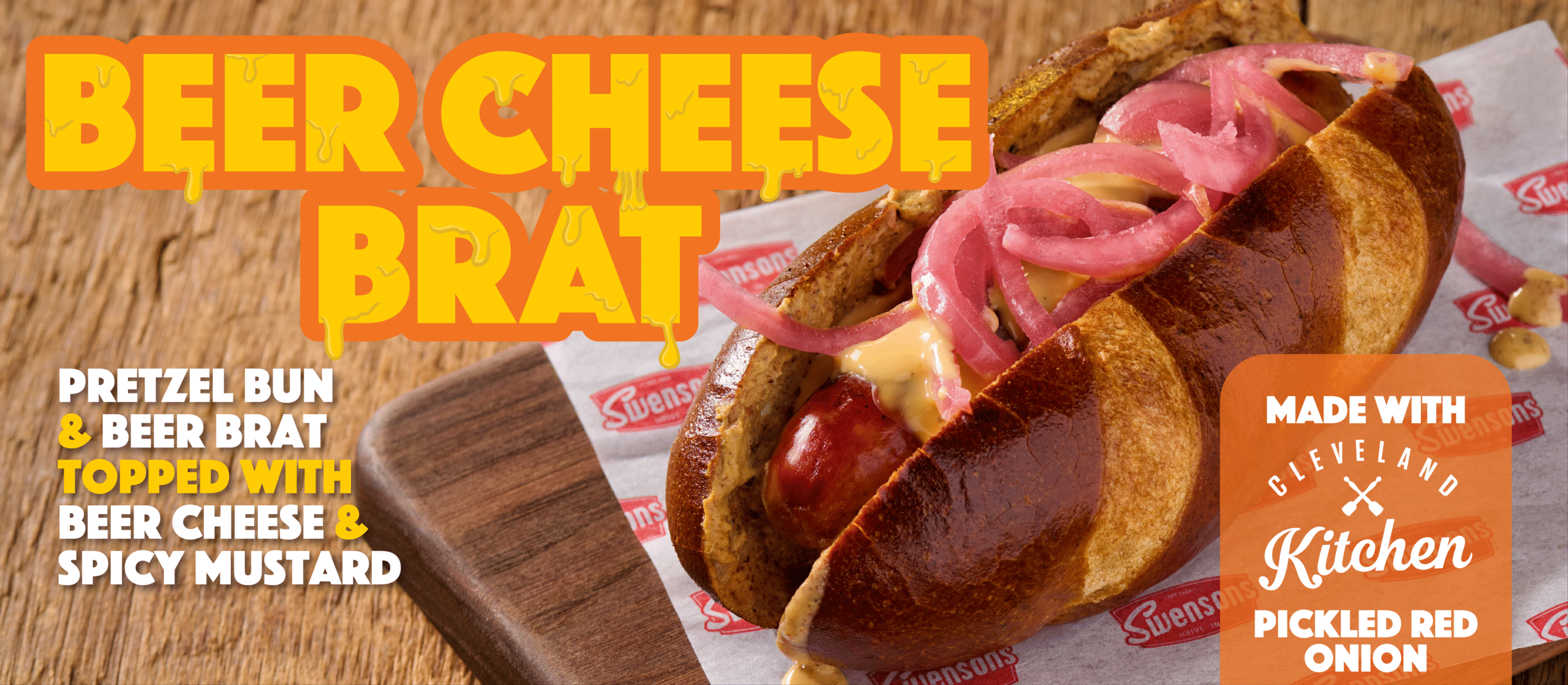 Swensons Beer Cheese Brat is an Oktoberfest-inspired treat! We’re serving up a grilled bratwurst with spicy mustard, oozy beer cheese sauce, and Cleveland Kitchen pickled red onions, all atop a toasty pretzel bun.